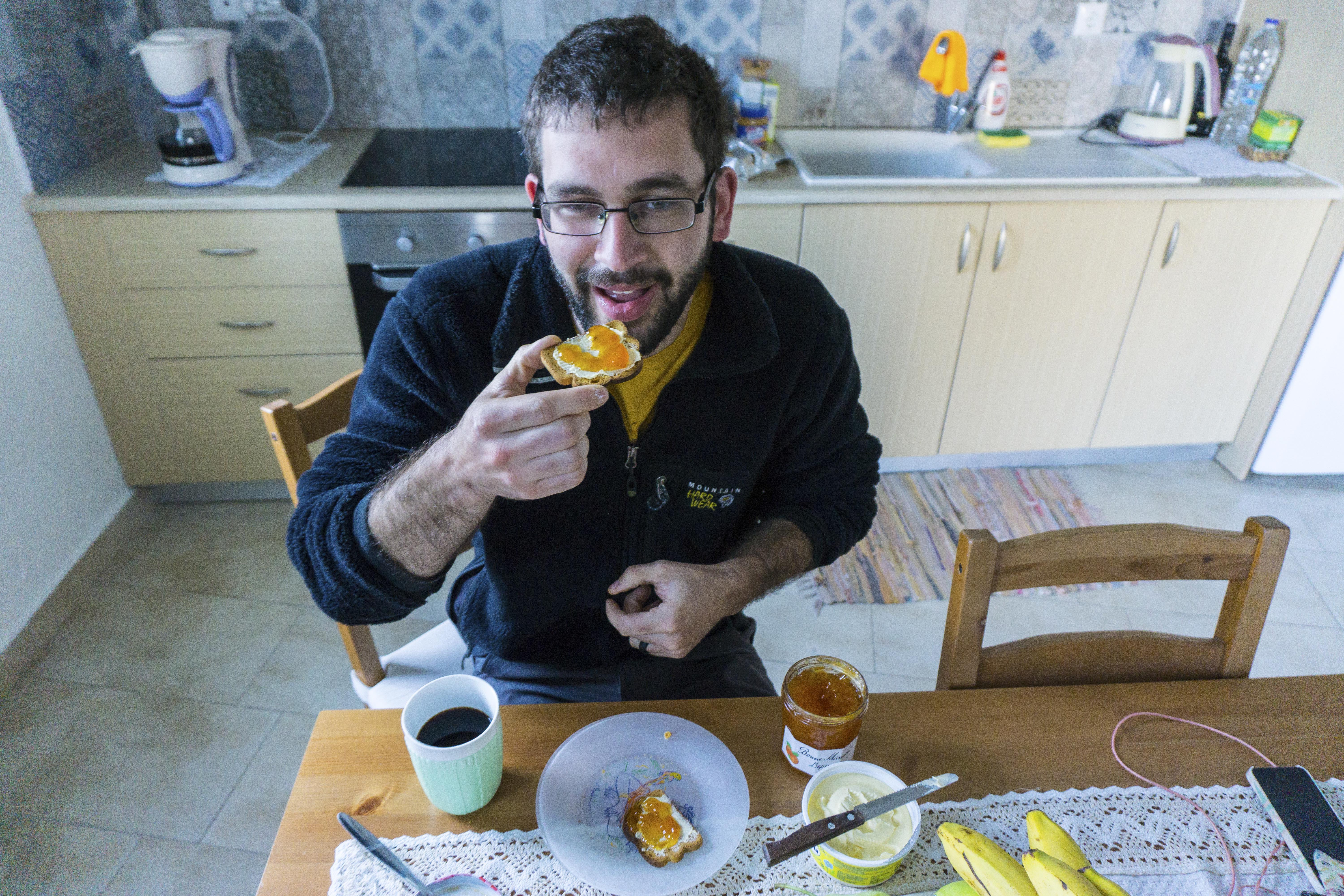 Jeremy eats gluten free, and the only gluten free bread readily available on Kalymnos was a crusty package of tiny toast.