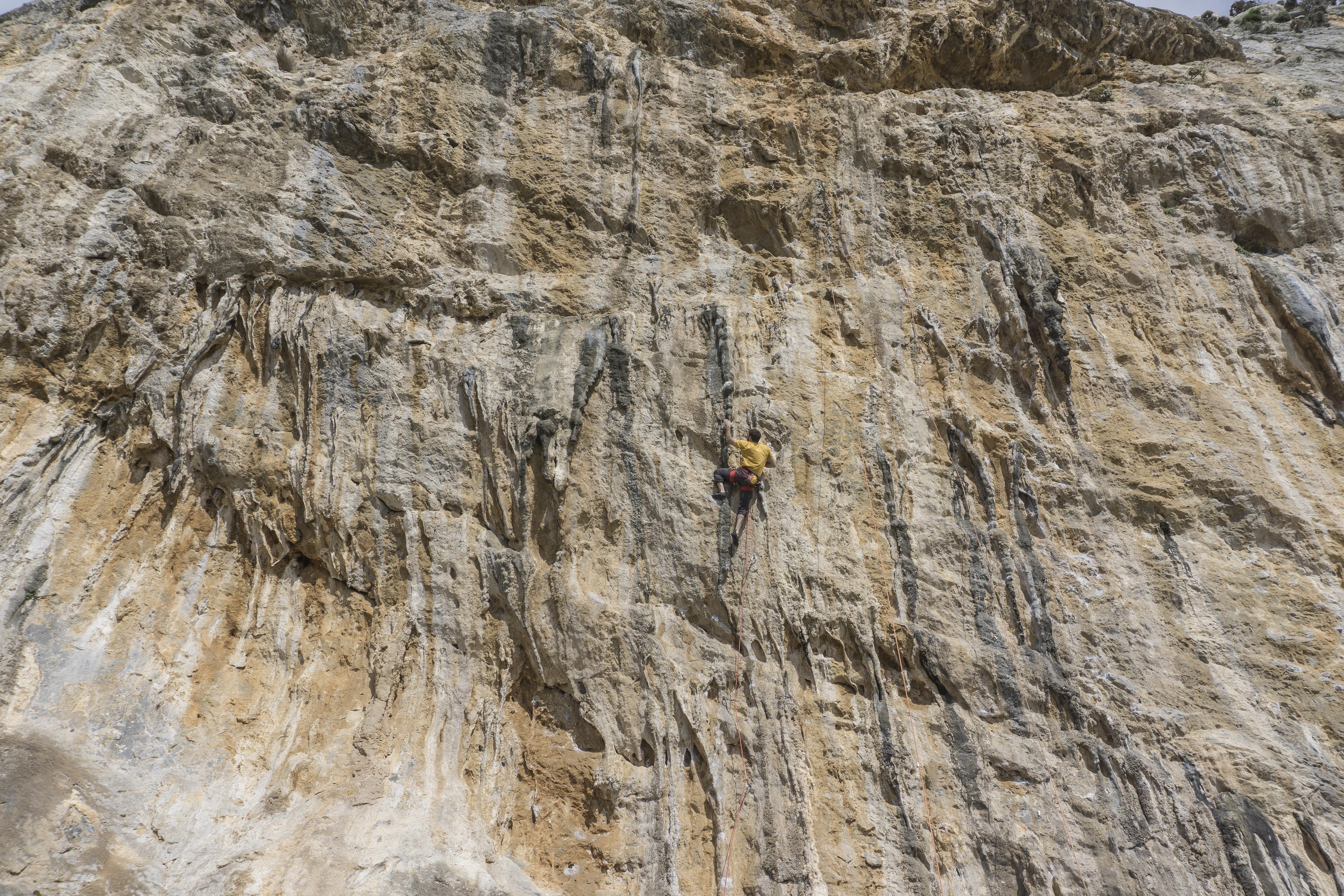 The entire Kalymnos universe revolves around sport climbing. Every bar and restaurant has a climbing guidebook for planning the next day’s adventure, signs and light fixtures are held up with salty frayed climbing ropes, posters scrubbed yellow by time and the corrosive ocean air show historic ascents, shops play youtube climbing videos on loop, and friendly Greek restaurant owners, who have never put on a harness, ask what crag you went to that day. One of the local convenient stores even doubles as a climbing shoe resole shop.