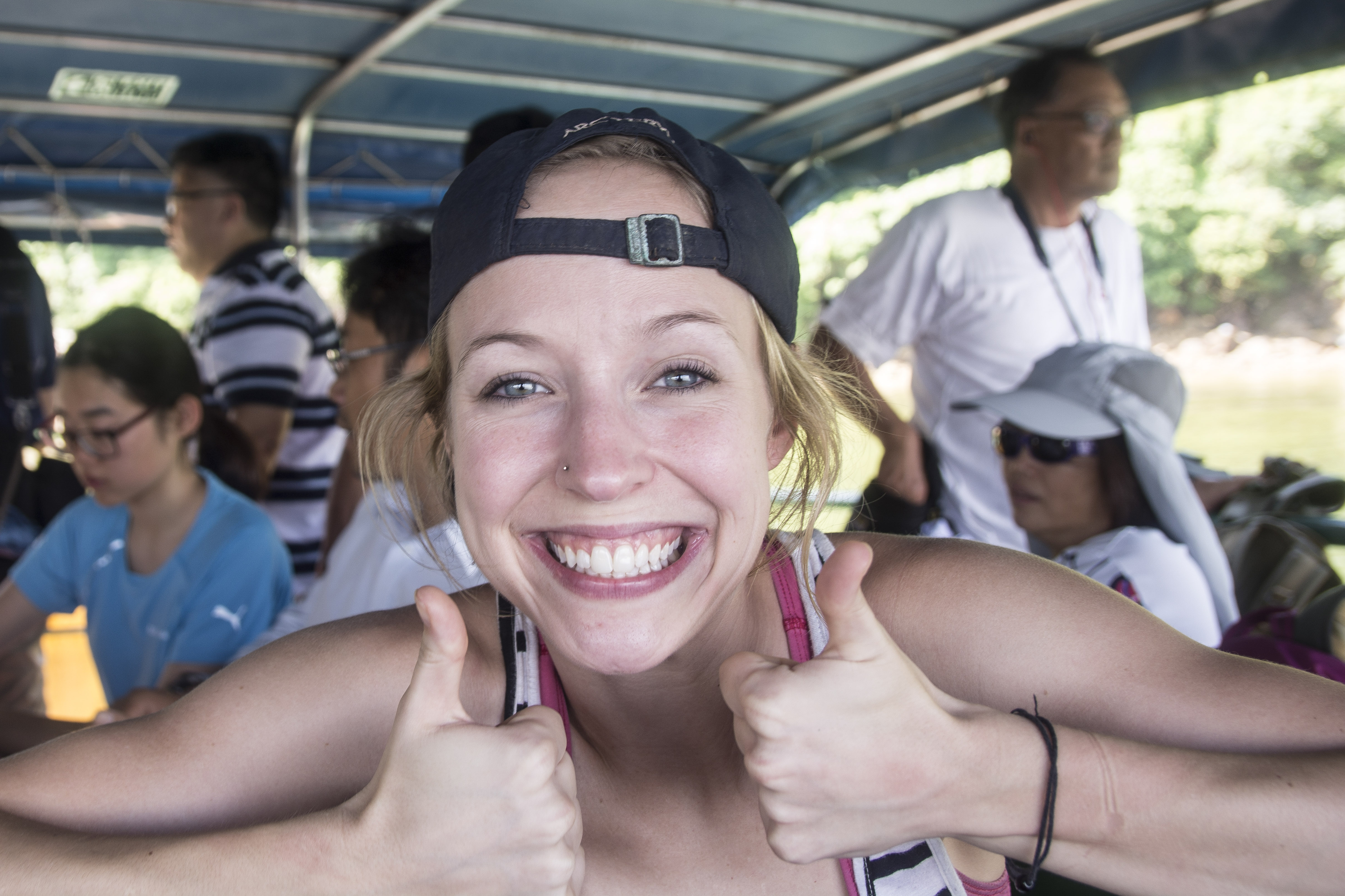 Katie, psyched for climbing after her nap on the ferry