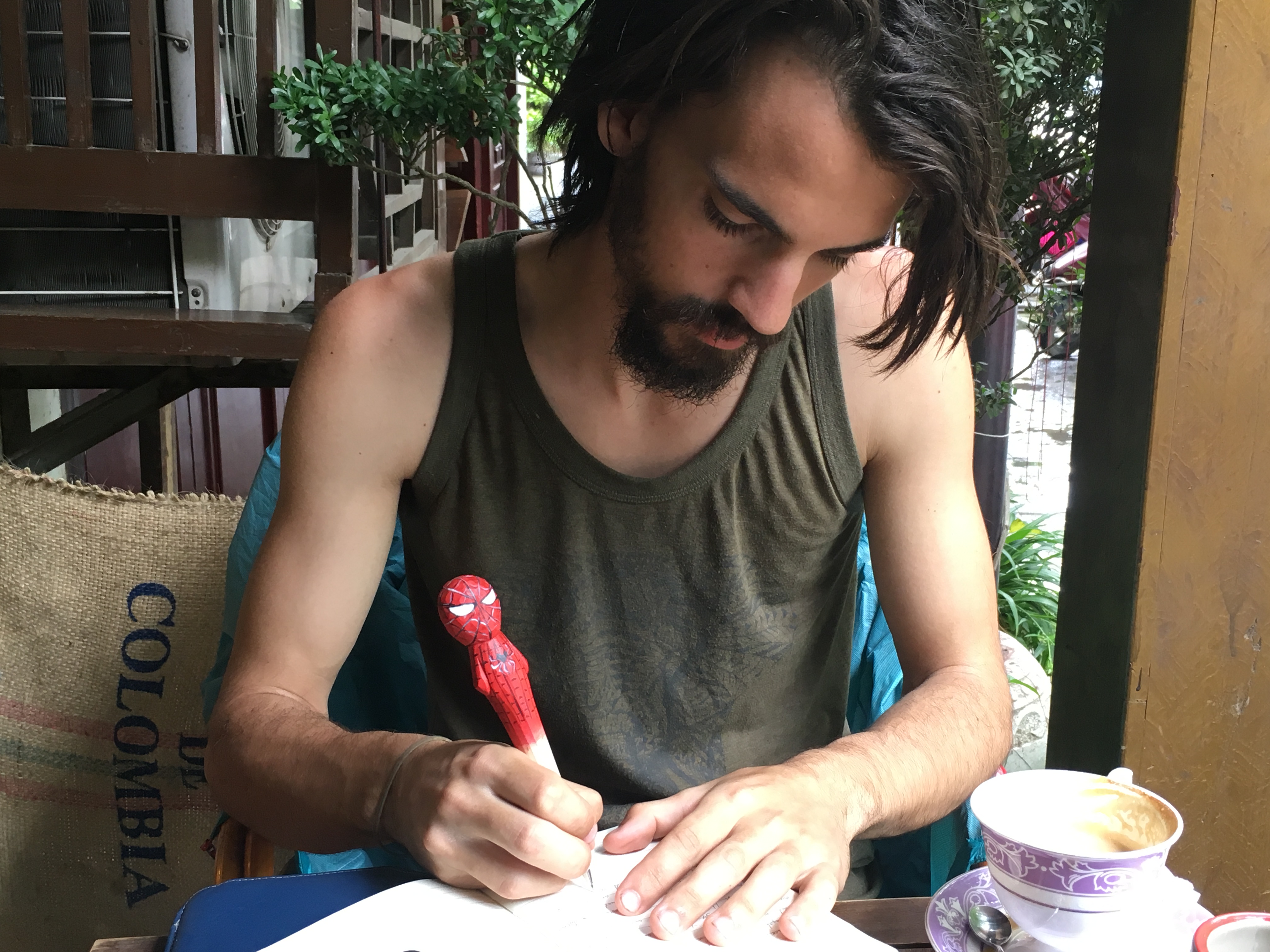 It took David several days to buy a pen, but when he did it was a carved wooden Spiderman pen.